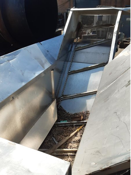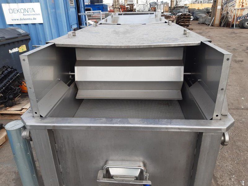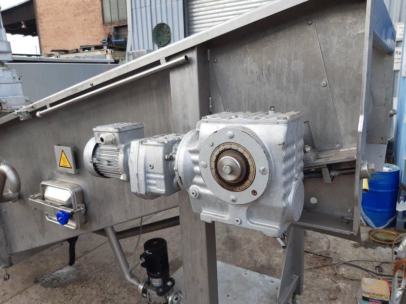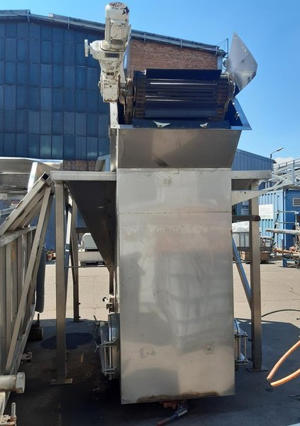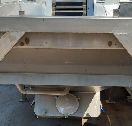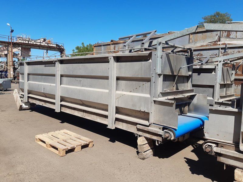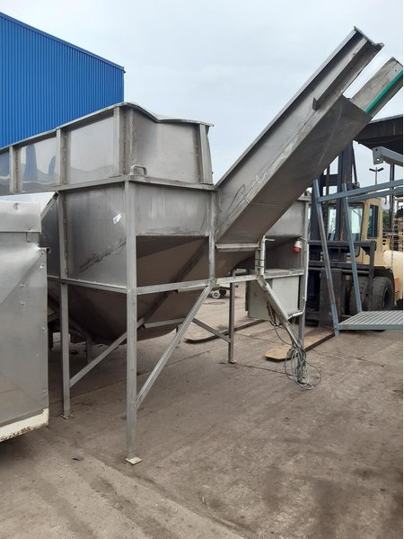 Stainless steel receiving hopper with discharge conveyor belt